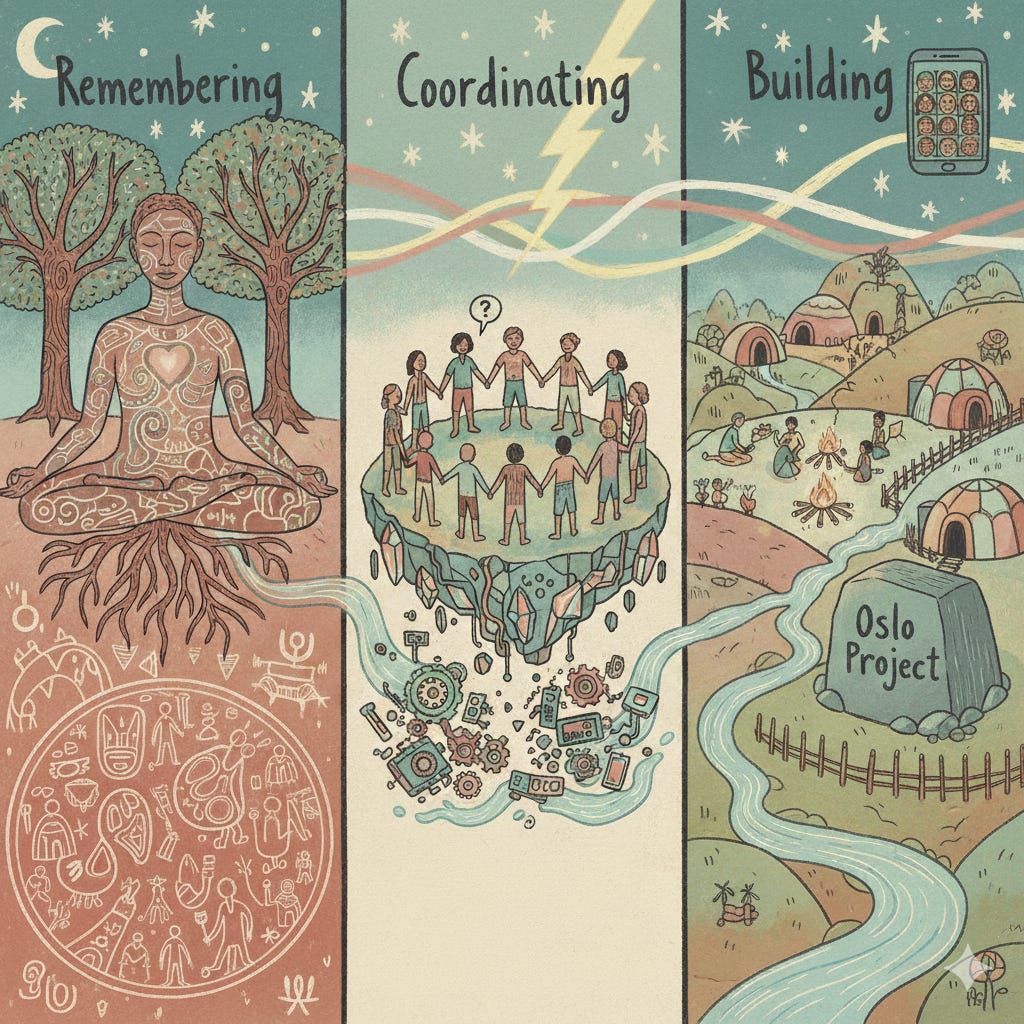the physical, social and emotional reality that deeply integrates the previous two steps is paramount. Most of us manage to connect to our deepest humanity and we often manage to get into coordinating coherence with others - in pockets. In pockets of space and time. Usually we get sucked back into the molochian hamster wheel. Even the most immersive experiences of this kind tend to have a half life of a few weeks at max.